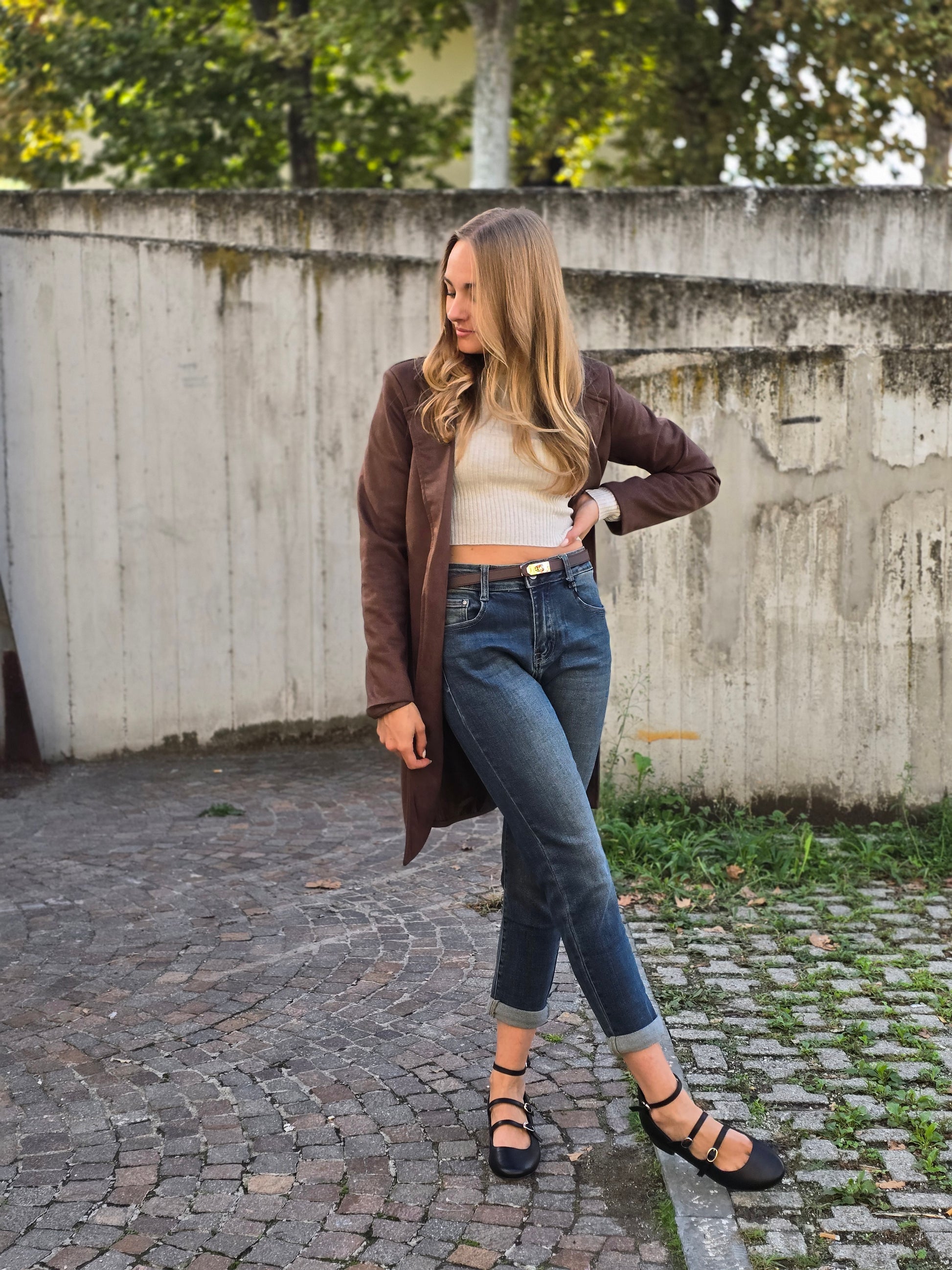 Cappottino in tessuto alcantara esternamente, foderato con cinturina in vita