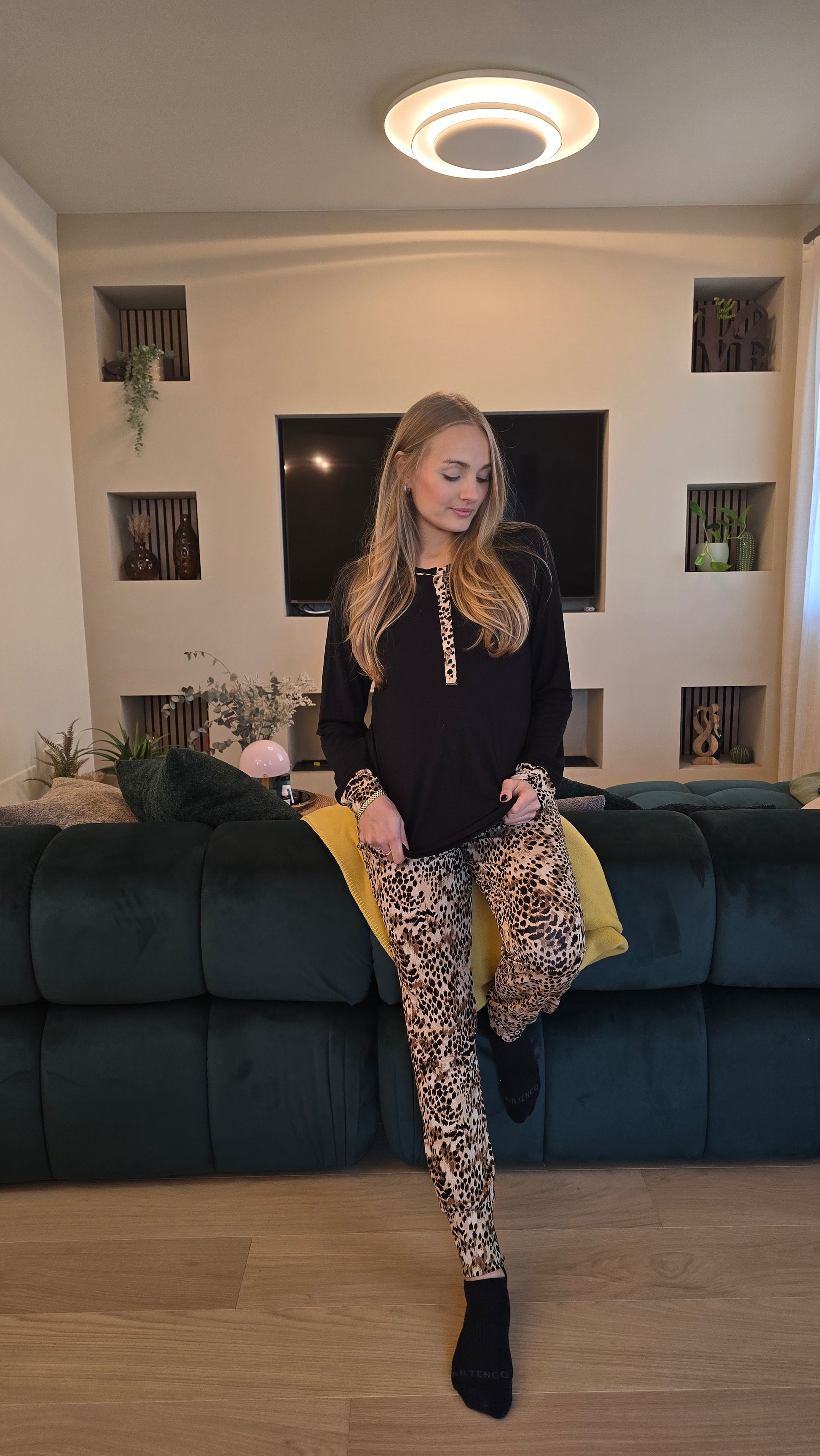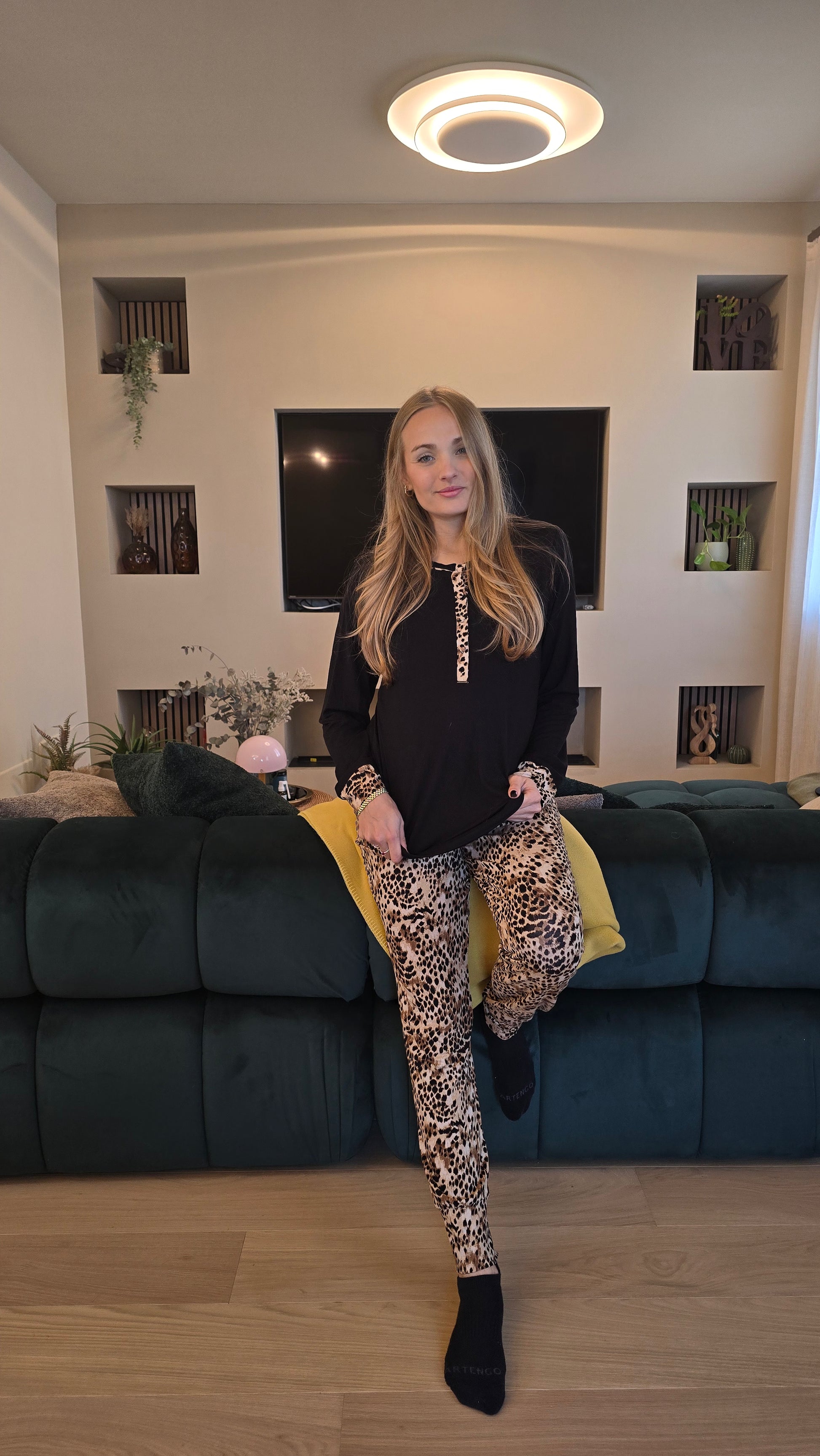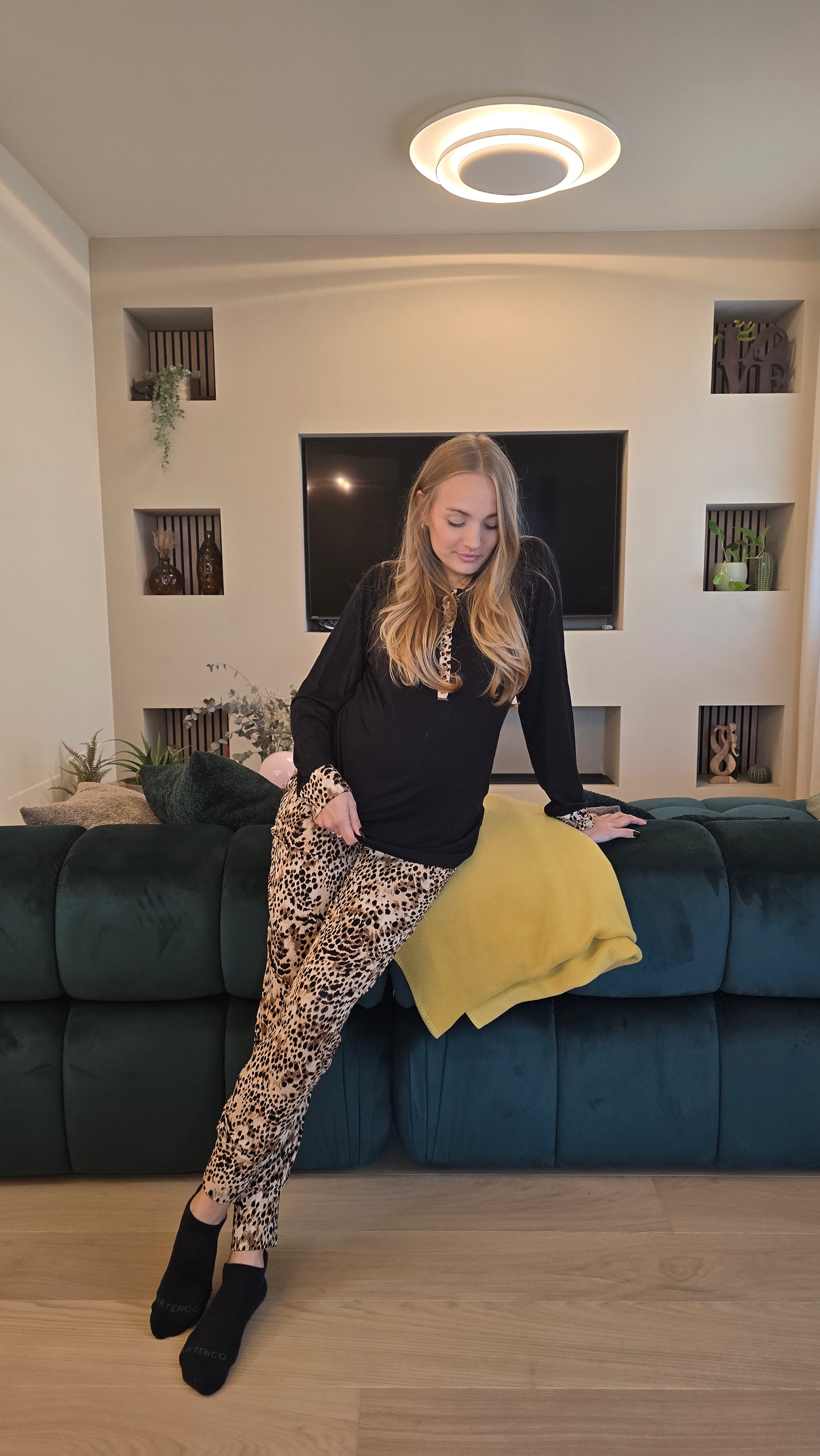 Pigiama elegantissimo, per chi cerca un tessuto che viene con te, morbido e fresco base nera con pantalone maculato animalier