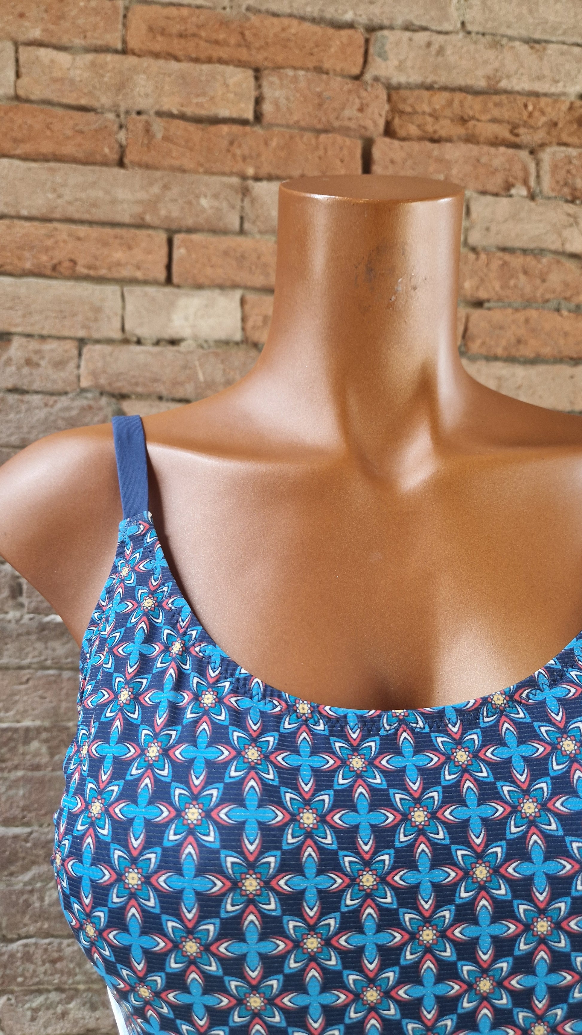Costume intero Made in italy con coppe preformate a base blu con fantasia sul seno e leggero filo d'orato che spende al sole
