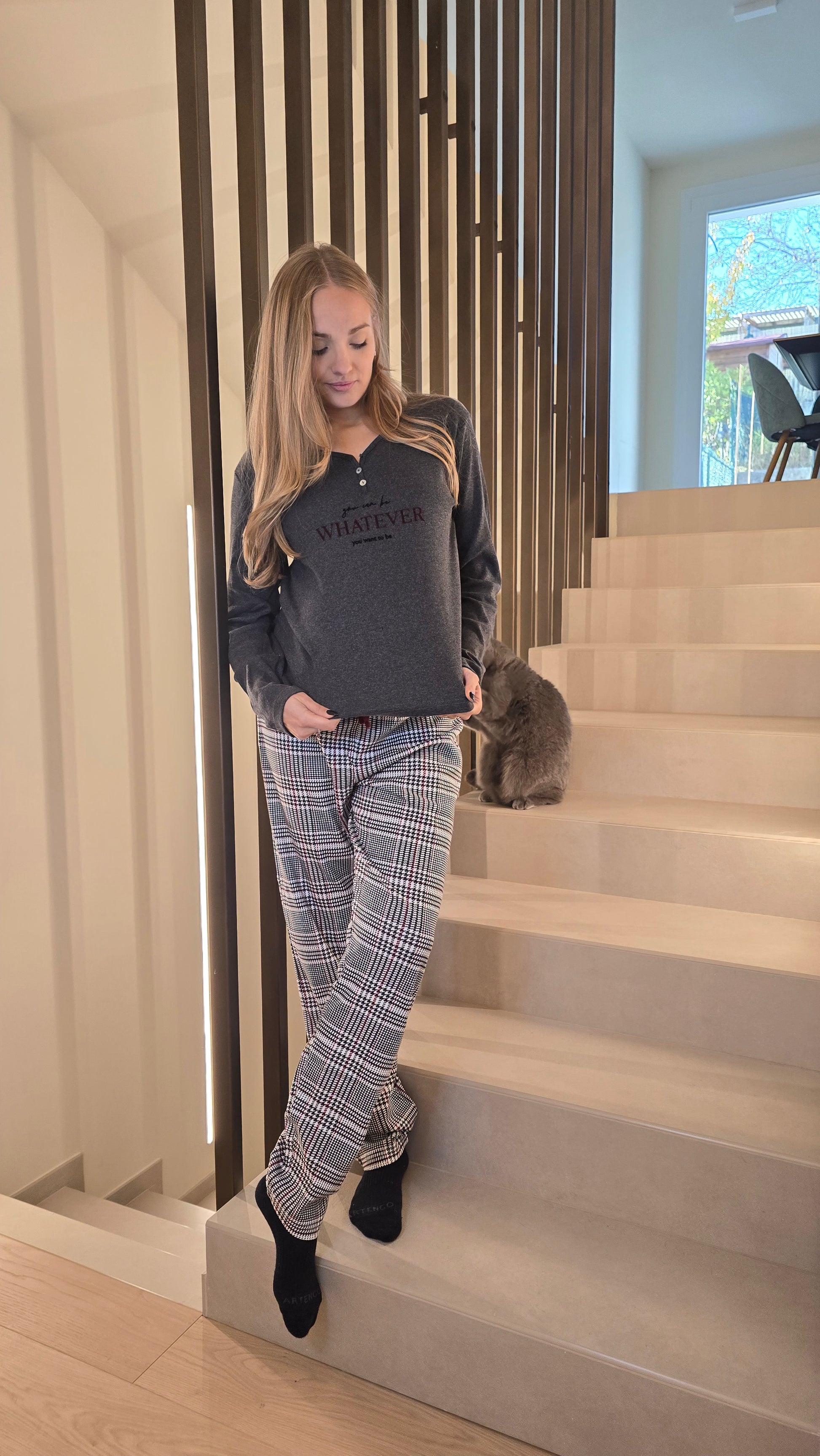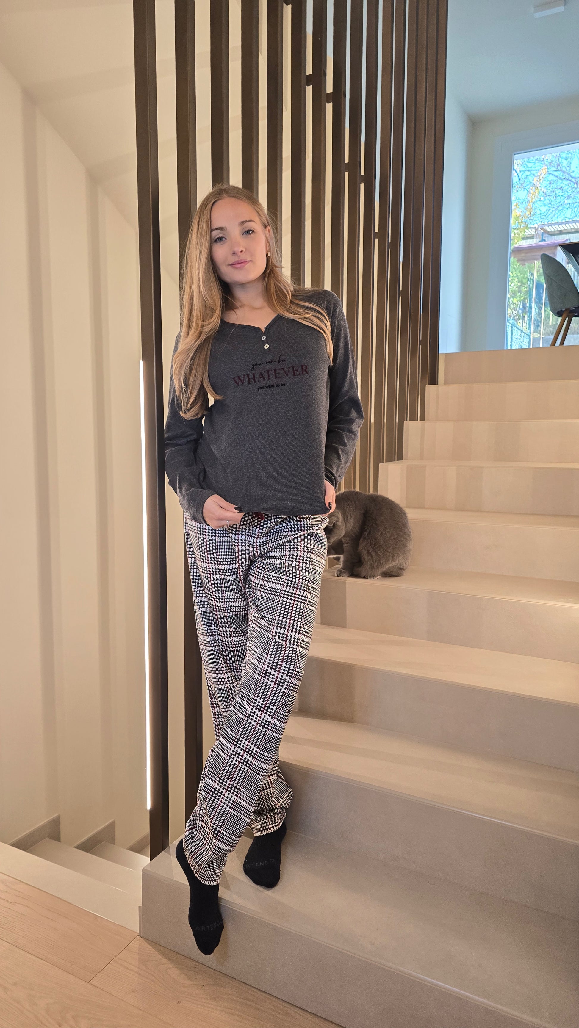 Maglia a costina morbida grigia con scritte bordeaux e pantaloni con coulisse scozzese