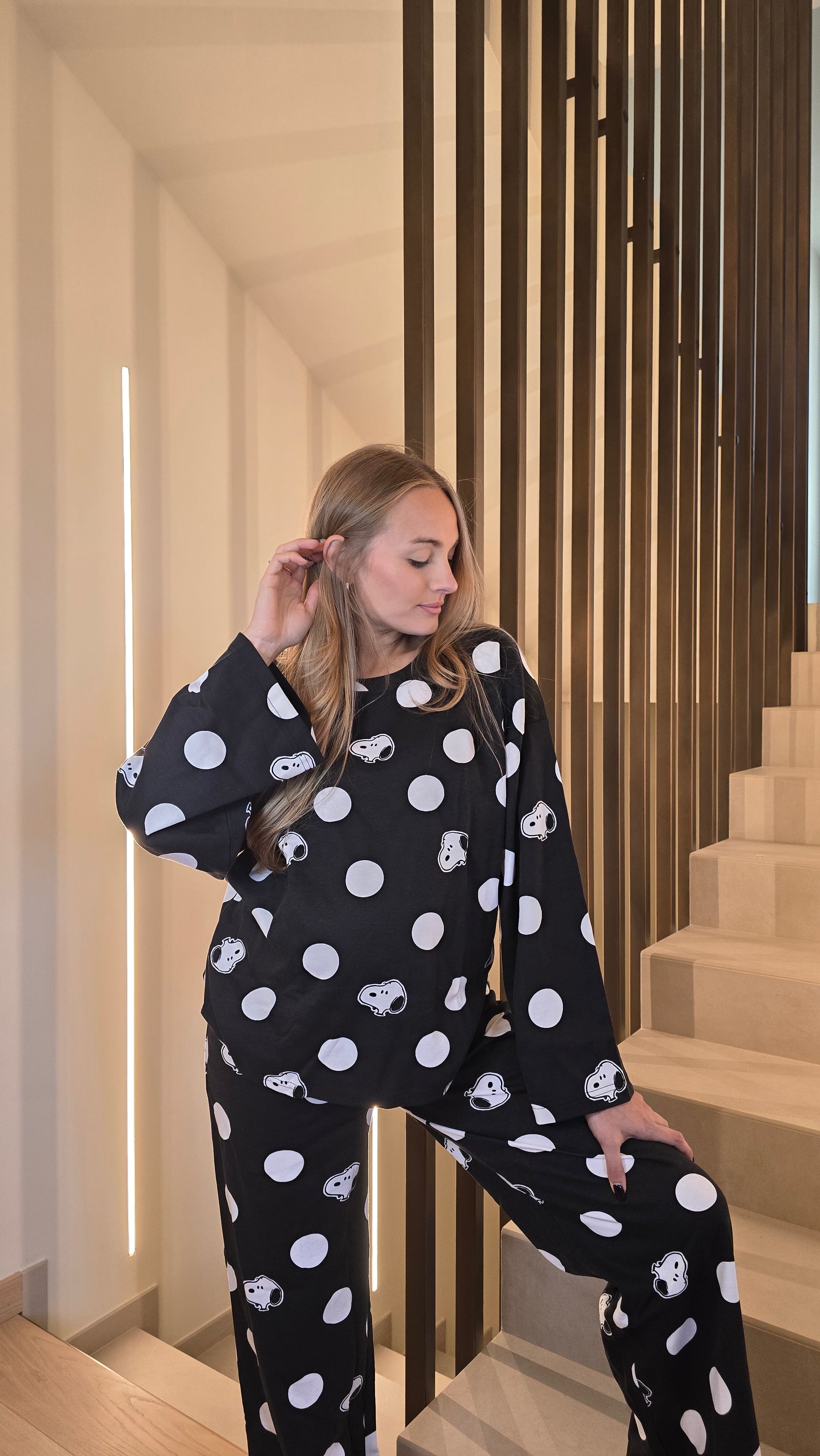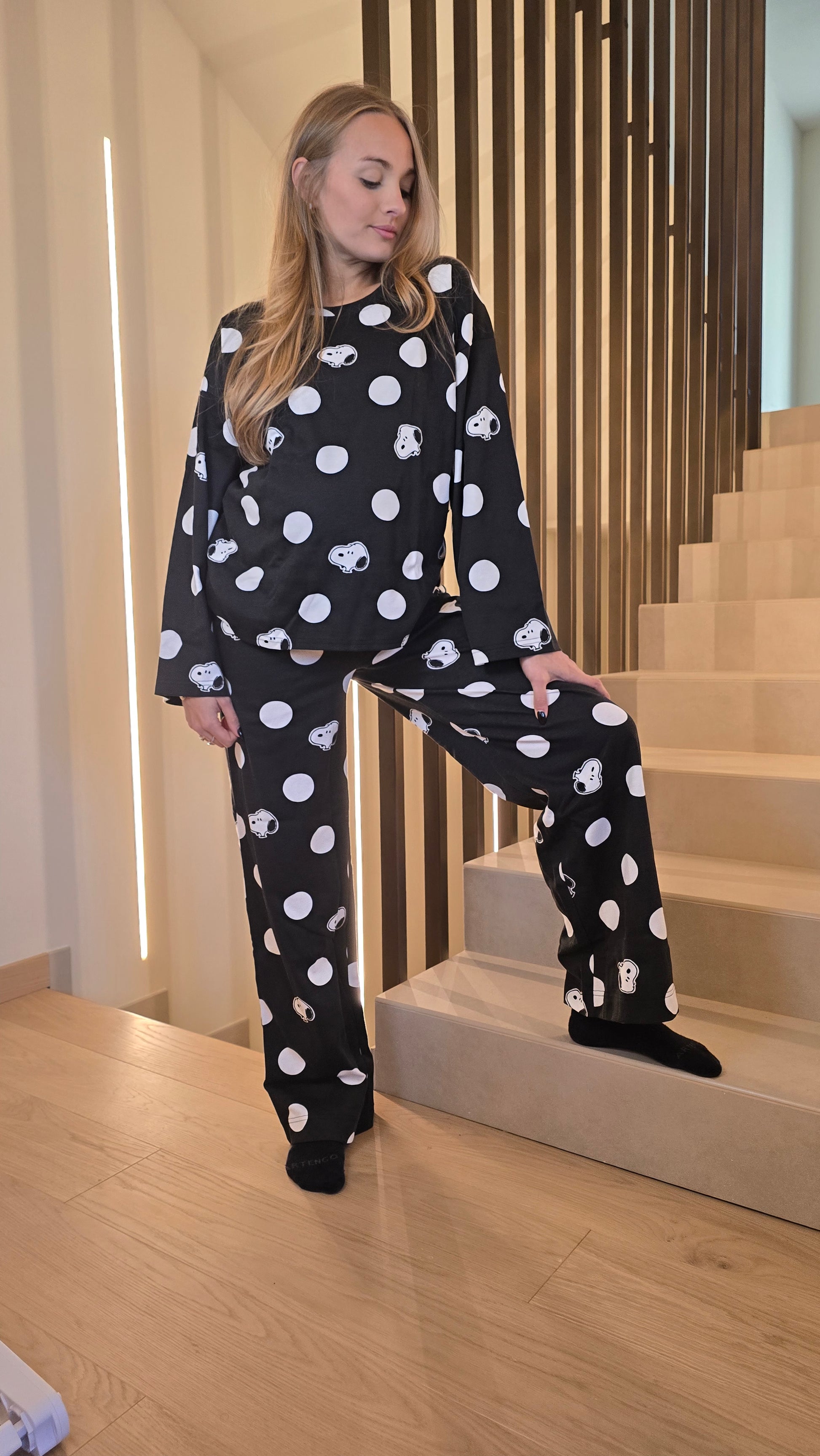 Base nera con poi e faccine Snoopy bianchi, pantalone a palazzo molto alla moda e maglia quadrata larghina con maniche larghe per il massimo comfort