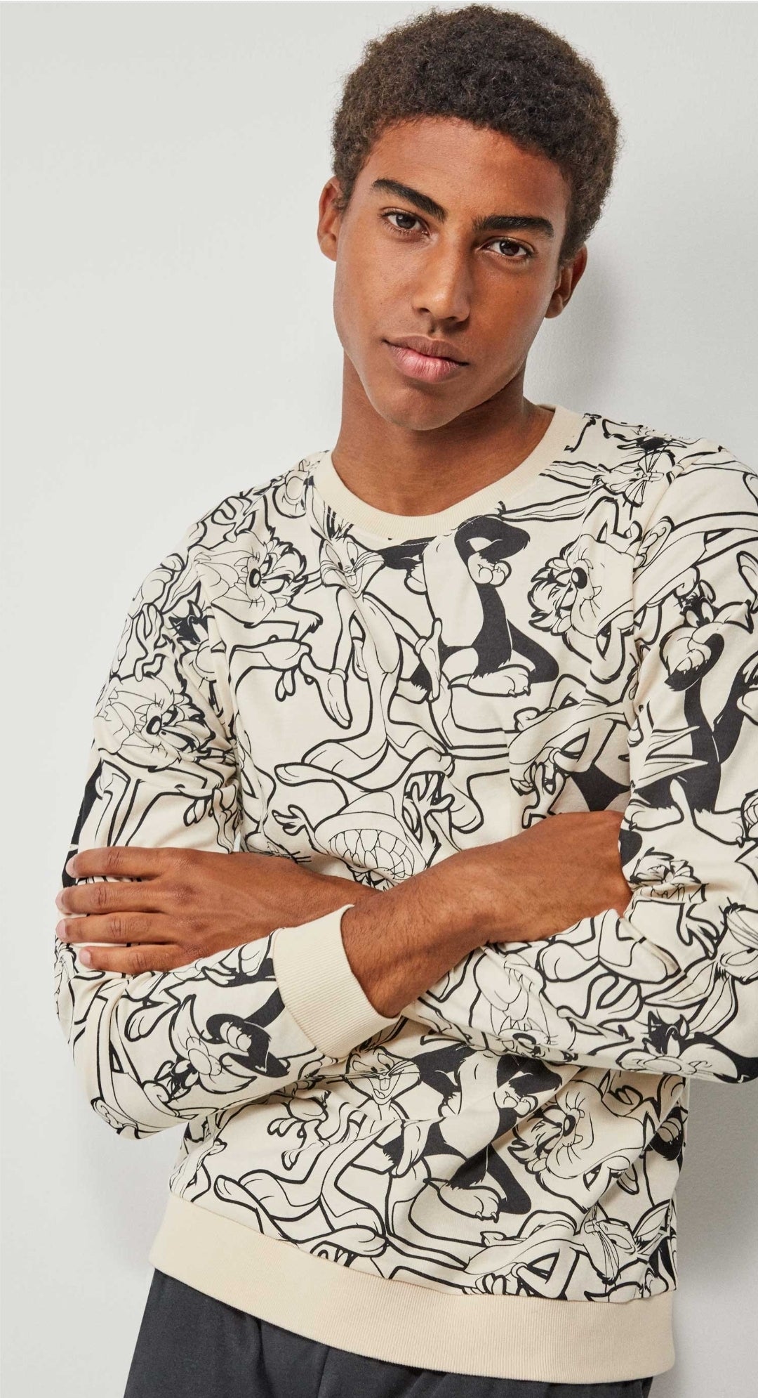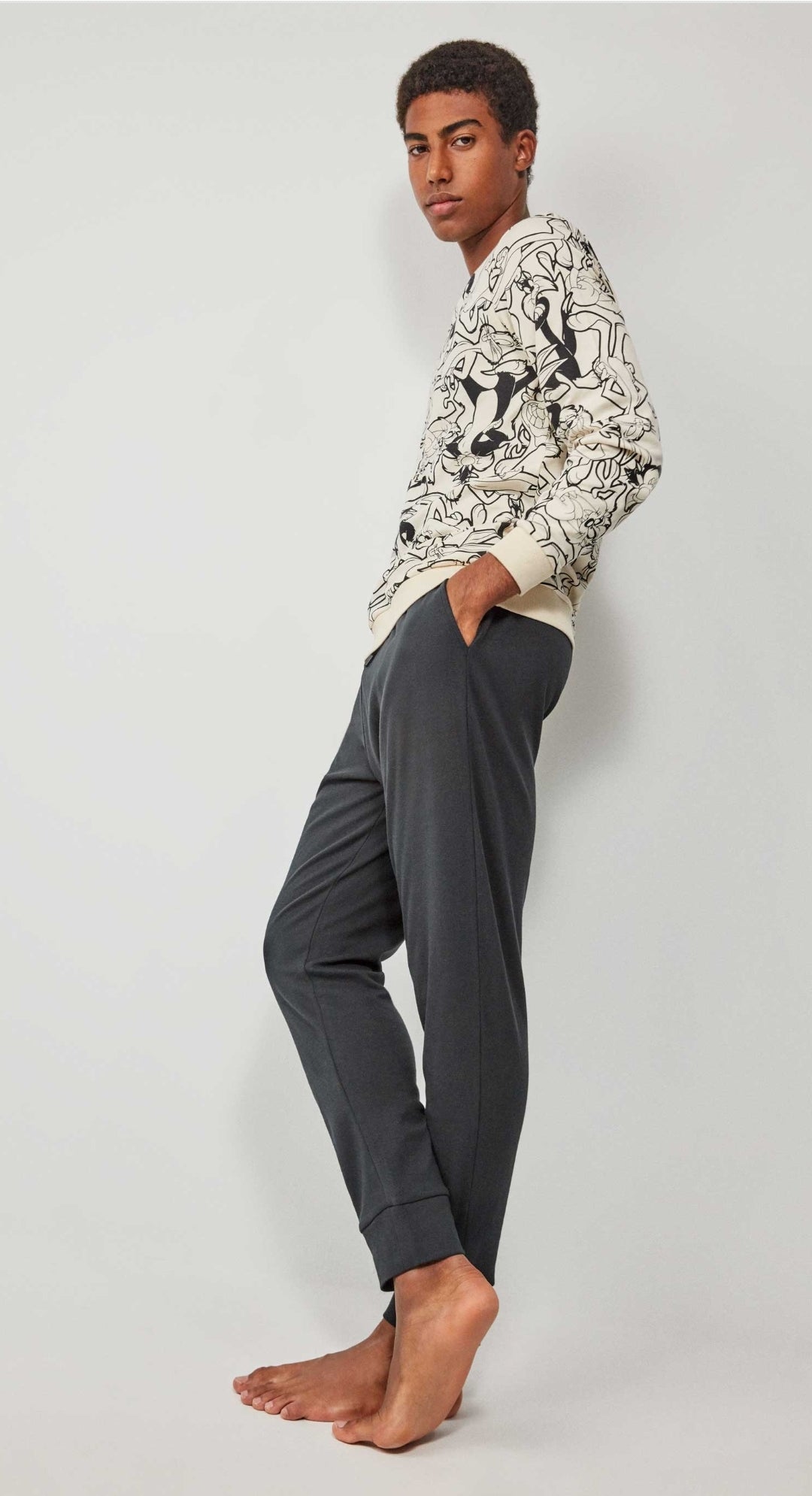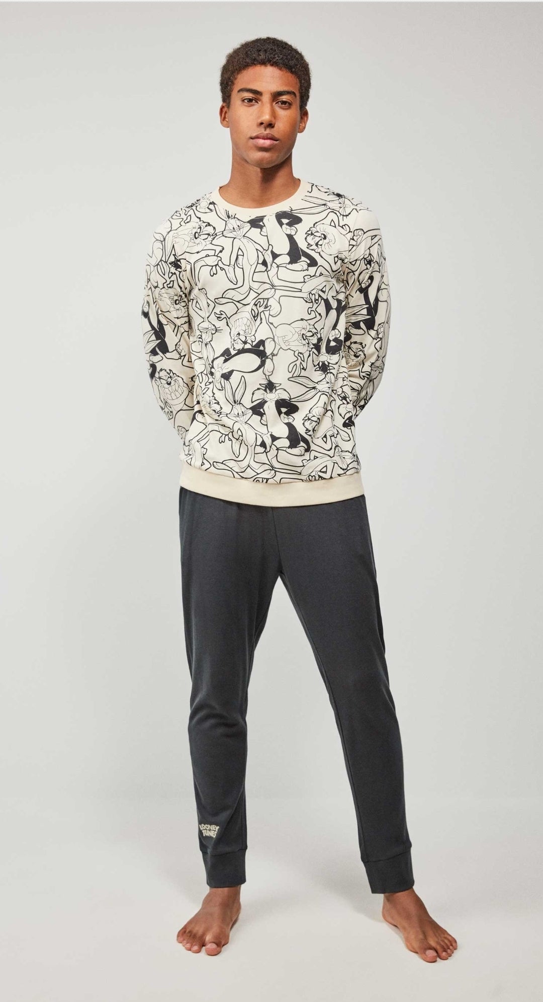 Pigiama da uomo di Looney Tones in tessuto jersey interlock, maglia a maniche lunghe con grafica e pantaloni a contrasto, regolabili in vita con elastico e laccio.